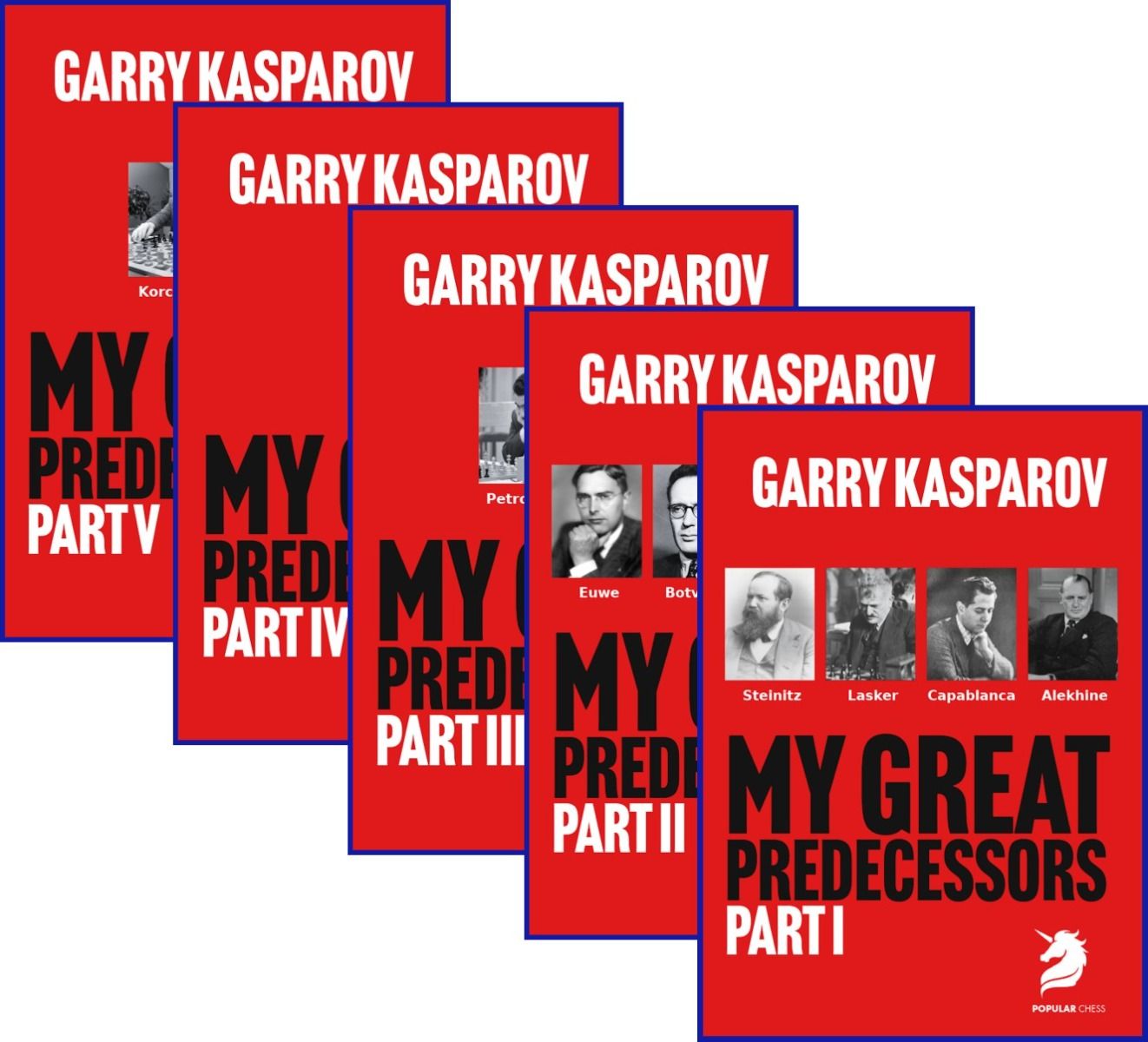 All Five volumes of Garry Kasparov's history of World Chess Champions from William Steinitz, in 1894, to Korchnoi and Karpov in the 1970's.